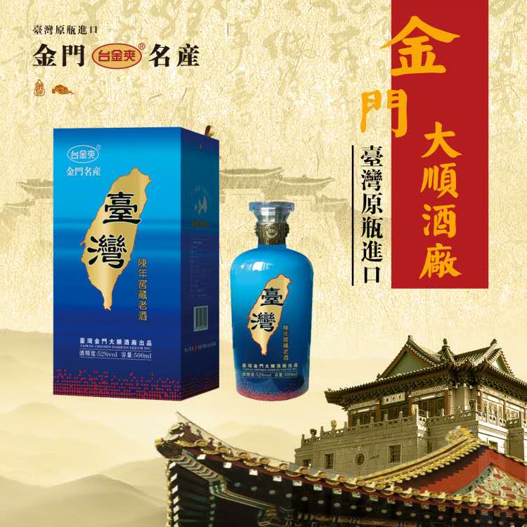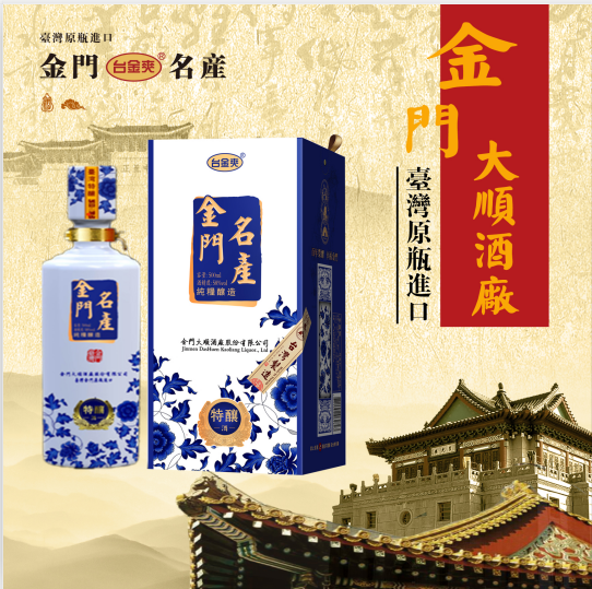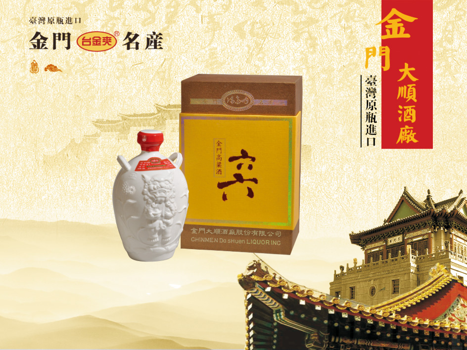金門大順酒廠,座落于金門北緯24.5度,地處海隅,濱大陸,得天獨(dú)厚的地理,使它擁有絕佳的水質(zhì)、空氣、氣候及原料的四大天然釀酒條件。金門大順酒廠的高粱酒釀造是利用金門特產(chǎn)『旱地高粱』、引用當(dāng)?shù)厮|(zhì)甘甜的泉水、金門潔凈的空氣與氣候條件,并承襲傳統(tǒng)古法之釀酒技術(shù),加上獨(dú)家的釀酒專業(yè)技術(shù)經(jīng)驗(yàn)【三離二鍋一翻】的發(fā)酵釀酒工藝,經(jīng)掐頭去尾后入庫,去蕪存菁。而造就出金門大順酒廠的高粱酒特色「清澈透明、質(zhì)地純凈、芳香濃郁」之一系列高粱酒。金門大順酒廠制酒承襲著金門得天獨(dú)厚的地理環(huán)境,加上三代流傳之古法醇釀技技術(shù),結(jié)合經(jīng)驗(yàn)與現(xiàn)代化生產(chǎn),釀出風(fēng)味獨(dú)特,香、醇、甘、冽的【臺(tái)島】【臺(tái)金爽】【牛樟芝高粱酒】【龍騰鳳舞】【紅雙十】【陳高吶】【臺(tái)灣小酒】等多樣系列產(chǎn)品。真實(shí)原味、清香散發(fā),甘冽醇厚的絕佳風(fēng)味。